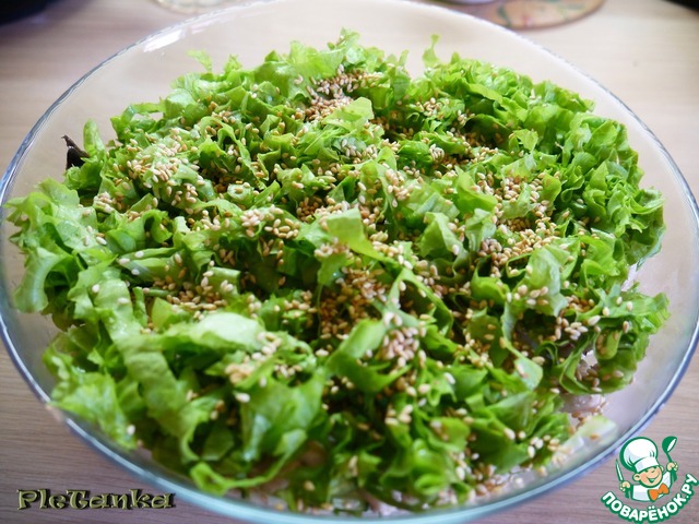 Листья салата нарезаем соломкой. Высыпаем наш кунжут.