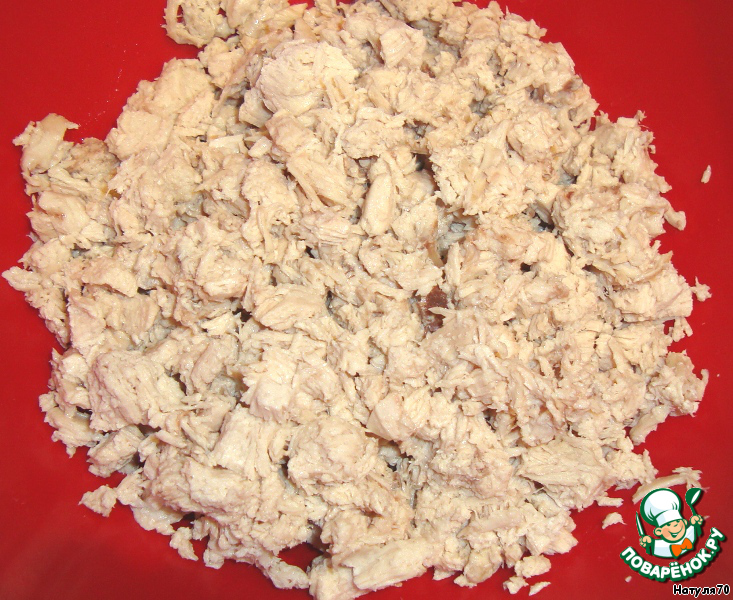Куриную грудку отварить, охладить в бульоне, в котором она варилась. Мелко нарезать.