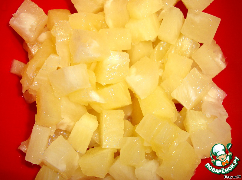 Ананас нарезать мелкими кубиками. Немного обсушить на салфетке, чтобы ушла лишняя жидкость.