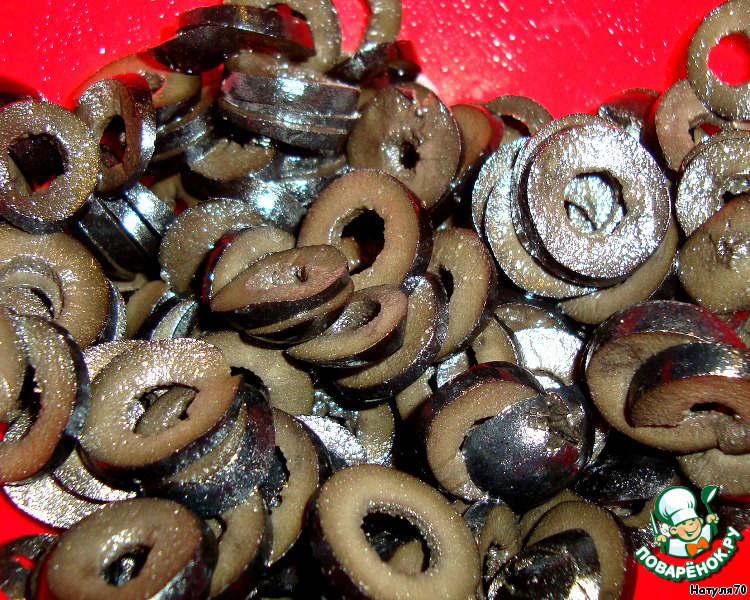 Маслины нарезать колечками. Отложить несколько колечек для украшения.