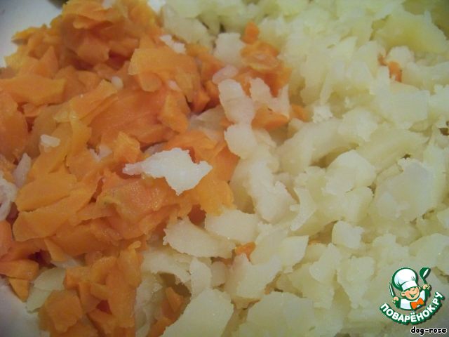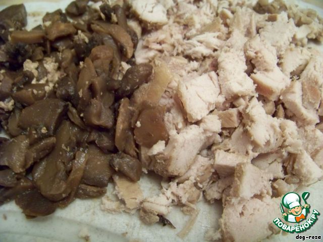 Отвариваем картофель, морковь, яйца, куриную грудку. Шампиньоны обжариваем. Охлаждаем все продукты и приступаем к нарезке.