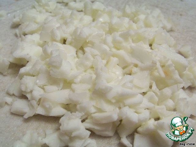 У отварных яиц отделяем желтки, они понадобятся для заправки. Белки рубим ножом.