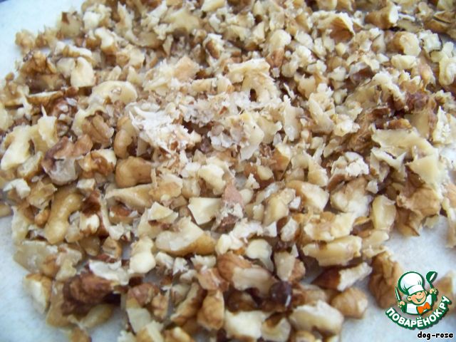 Грецкие орехи измельчаем, у меня не очень мелко.