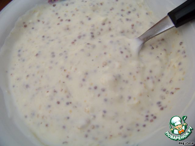 Для заправки разминаем вилкой желтки с горчицей, добавляем баночку йогурта и перемешиваем.