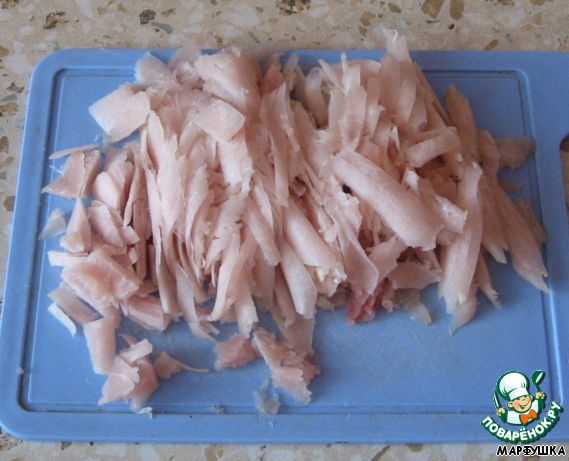Тонко режем куриное филе и обжариваем до готовности (очень быстро жарится, не отойти от плиты)