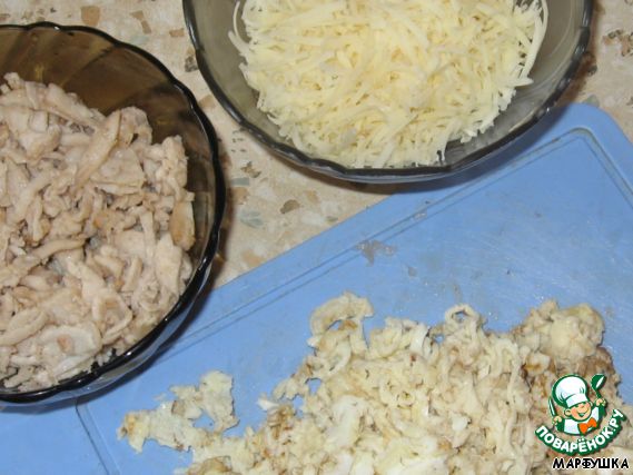 Готовые ингредиенты - натертый сыр, филе и омлетные блинчики.
