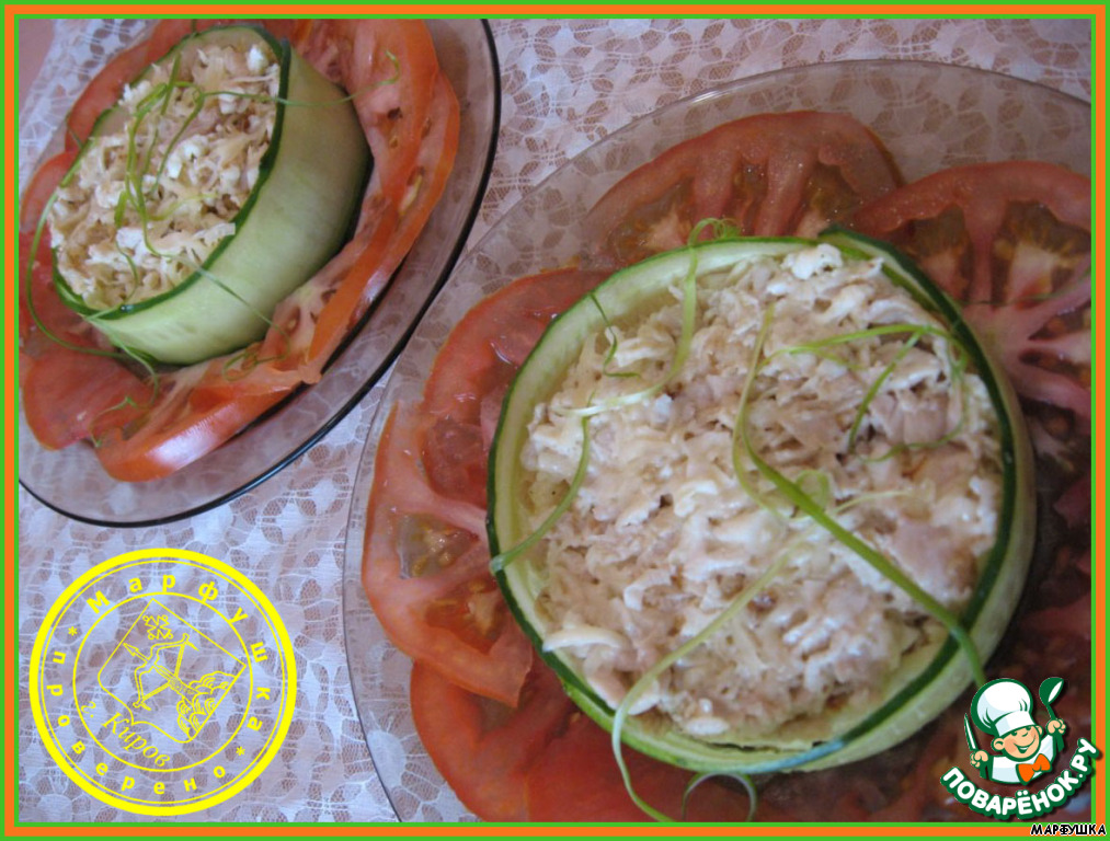 | Отличный салатик для романтического ужина, подойдет даже для сидящих на диете девушек - середину отдаем кавалеру (ему силы еще понадобятся ; -)), а все остальное съедаем сами! |
