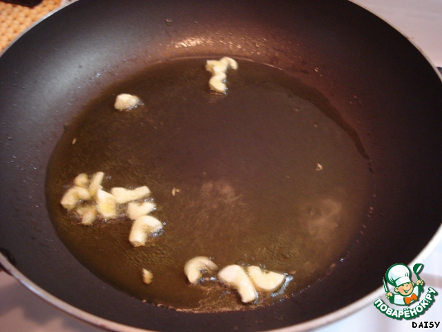 На сковороде разогреваем масло и кладем туда разрезанный чеснок. Обжариваем чеснок до золотистого состояния.