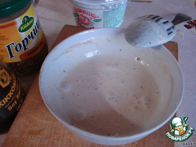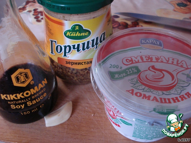 Сметану, измельченный зубчик чеснока, соевый соус и горчицу смешиваем и соединяем вместе, лучше мешать венчиком.