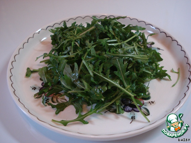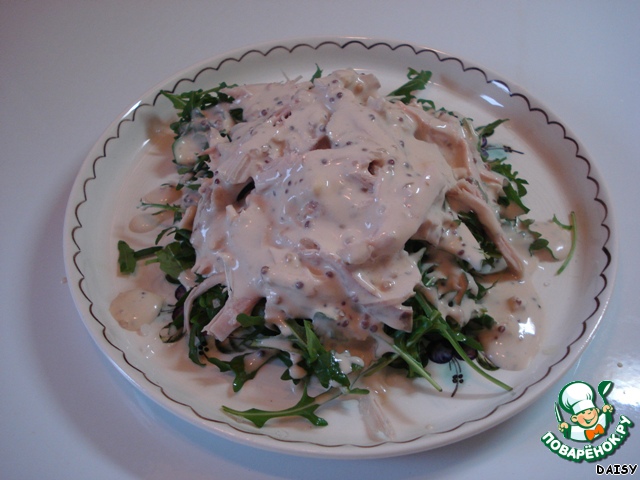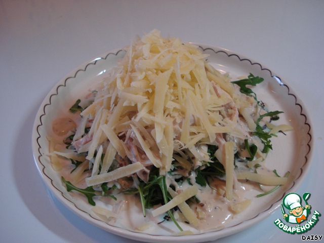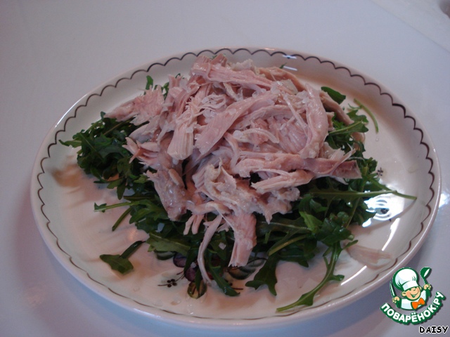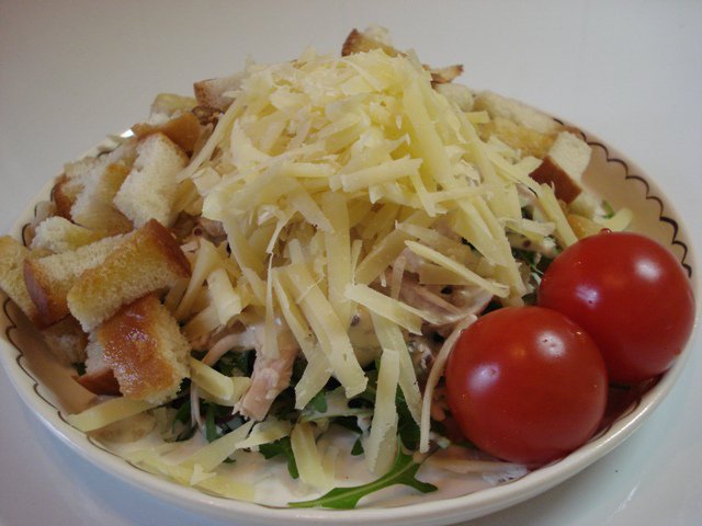 Кто-то скажет: «Это же Цезарь!» - и ошибется, рецепт куриного салата с соусом «Цезарь» совсем другой. Мне его прислала моя новая подруга, а ей подарил шеф-повар какого-то ресторана. Соус другой, курица жареная и т. д. Уверена, что он вкуснее моего, но этот вариант мне легче приготовить, т. к. отварная курица у меня есть почти всегда, а рукколу я обожаю и тоже часто покупаю.