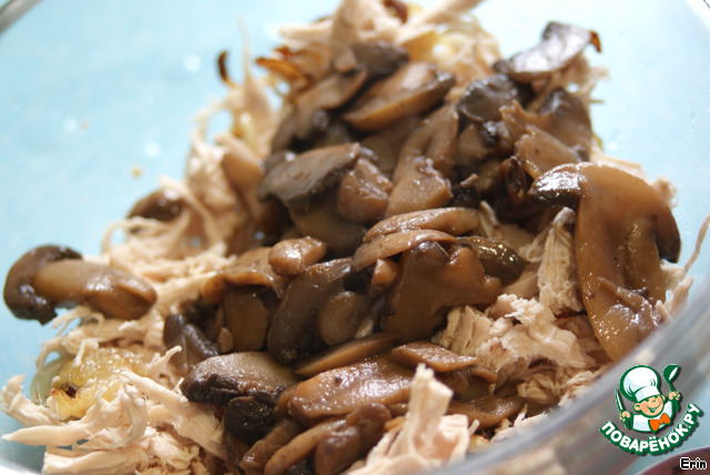 Грибы выкладываем на сковородку, в которой жарились грибы. Они замороженные, тушим их в образовавшейся воде. Соединяем с курицей и луком.