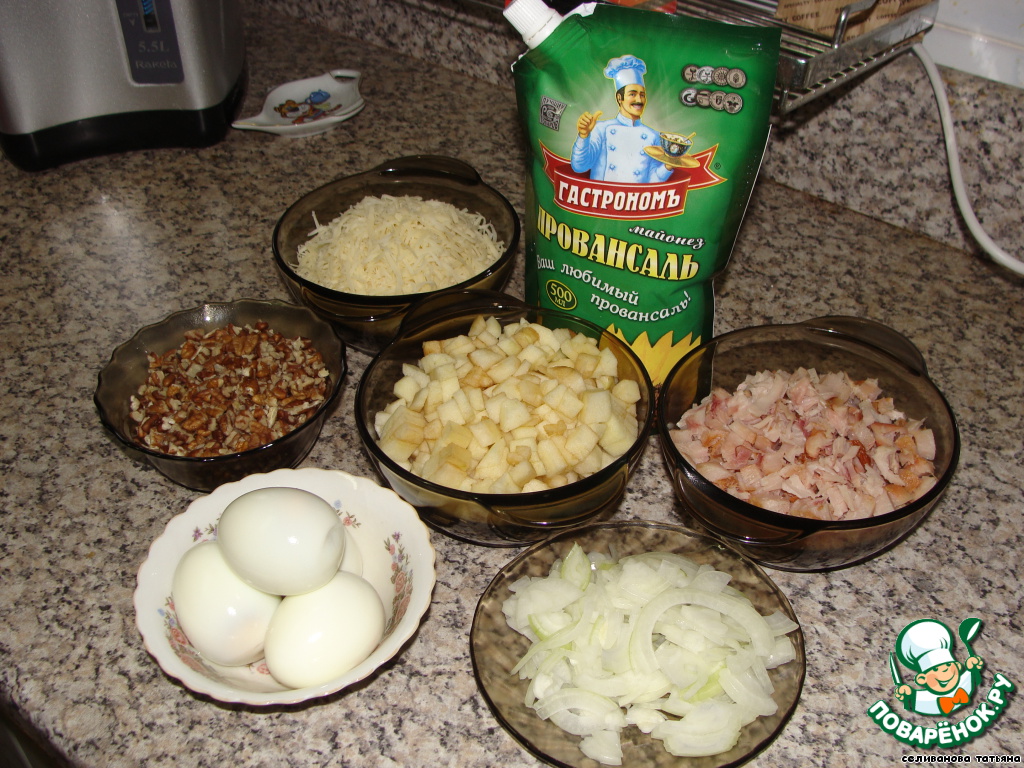 Четвертый слой - грецкие орехи, молотые не слишком мелко. И майонез.