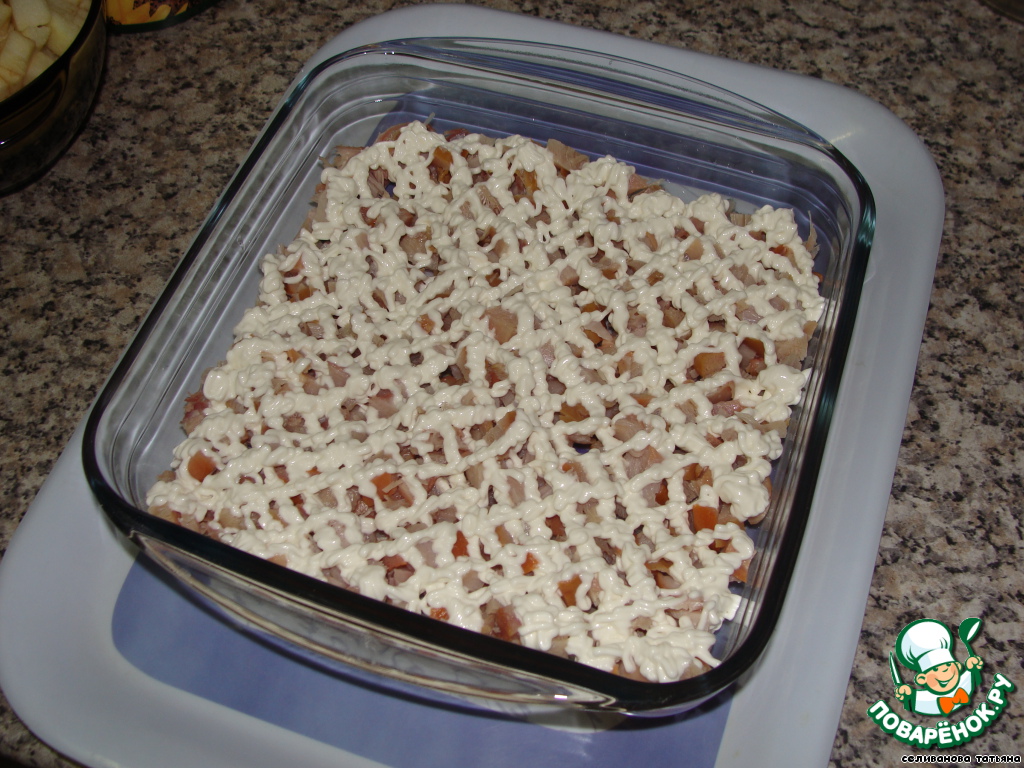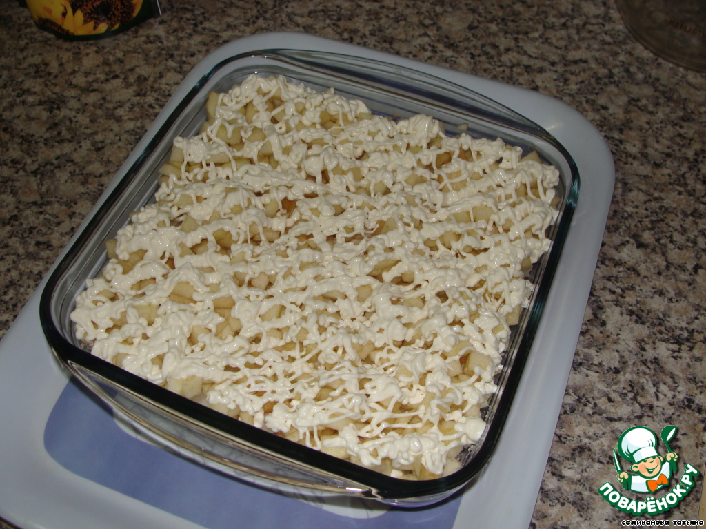 Третий слой - яблоки, нарезанные кубиками (у меня были не крупные) и майонез.