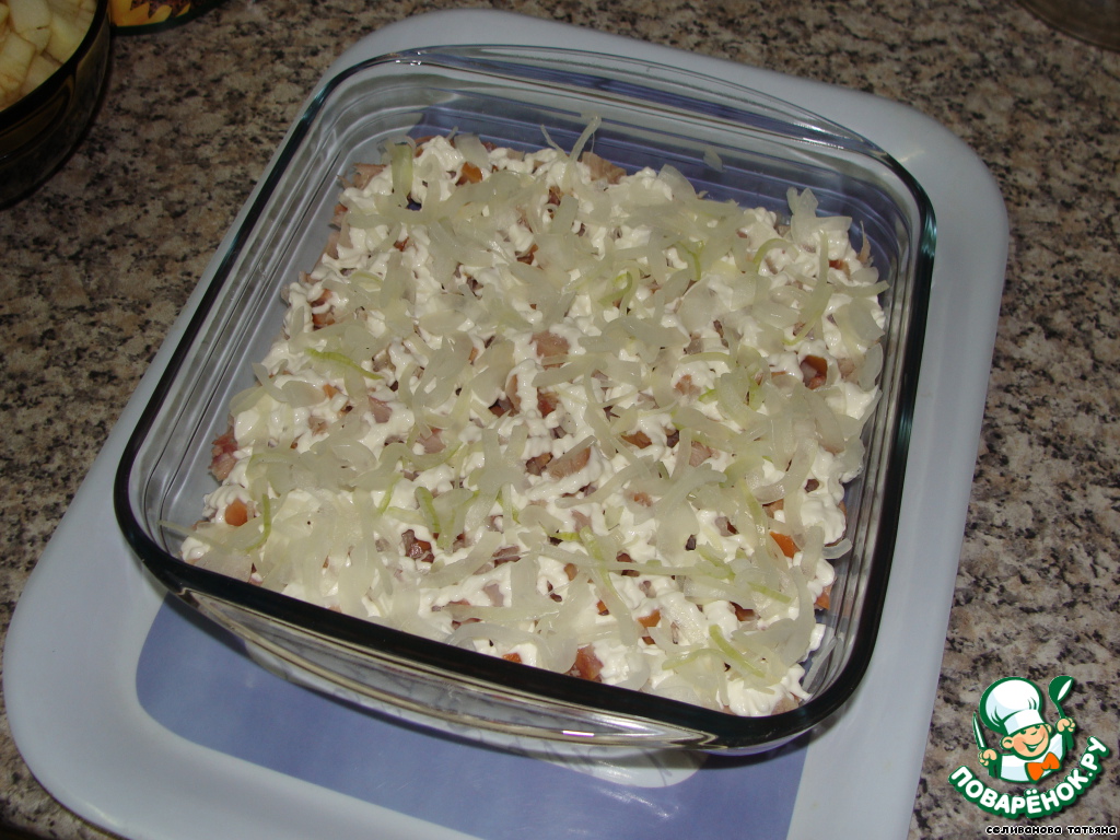 Второй слой - лук, предварительно ошпаренный кипятком.