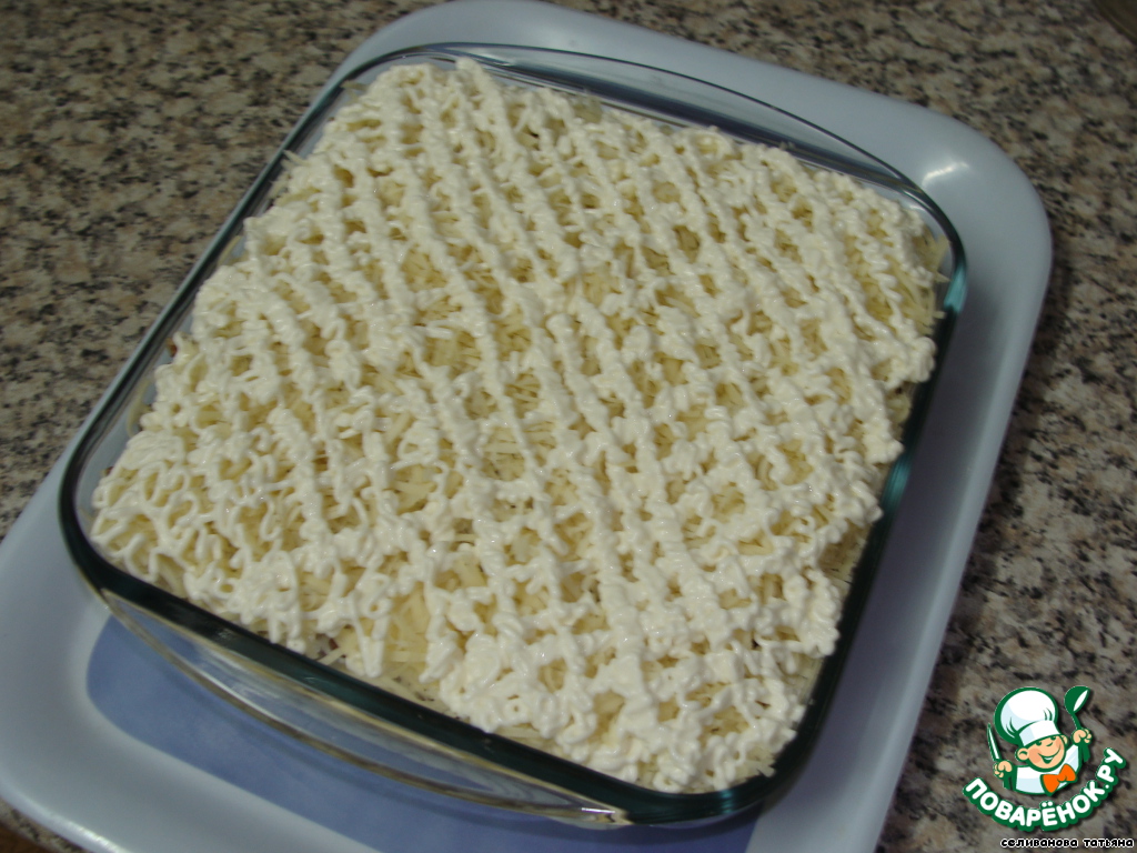 Пятый слой - тертый сыр и майонез.