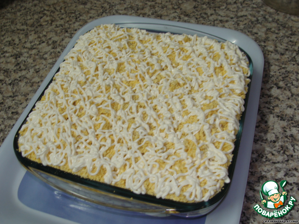 Шестой слой - тертый яичный желток и майонез.