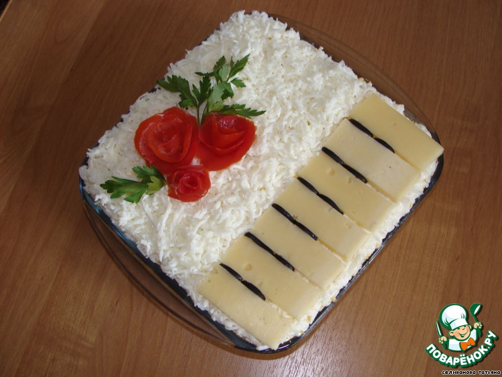 Седьмой слой - тертый яичный белок. Из сыра делаем имитацию белых клавиш, из маслин-черных клавиш. Из помидорки и петрушки делаем цветы.