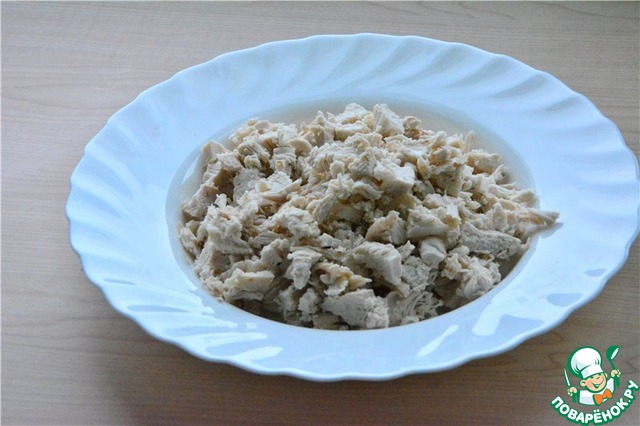 Куриную грудку отварить, охладить, мясо нарезать небольшими кусочками
