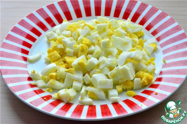 Яйца отварить, нарезать кубиком
