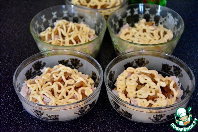 Итак, все подготовлено, начинаем собирать салат в порционные пиалки. Первым слоем выкладываем куриное мясо, на него лук, делаем сеточку из майонеза