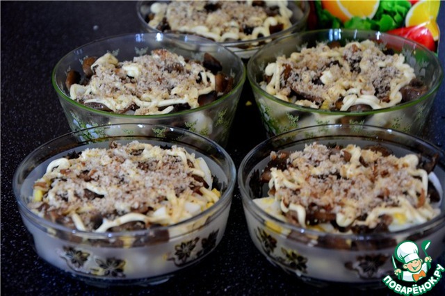 Следующим слоем идет вареное яйцо, затем грибы, далее посыпаем тертым орехом. Опять промазываем майонезом