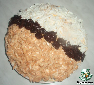 6 слой - укладываем на одну половину салата белки белые, а на вторую - коричневатые. По середине укладываем нарезанный чернослив. Дать ему немного постоять.