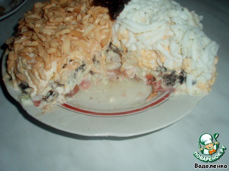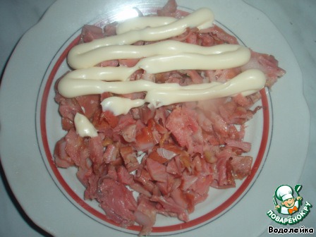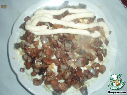Салат укладывается слоями и каждый слой смазывается майонезом.