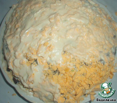4 слой - нарезанный чернослив. Его предварительно размочить в воде. Чернослива я положила не очень много и особо не смазывала майонезом.