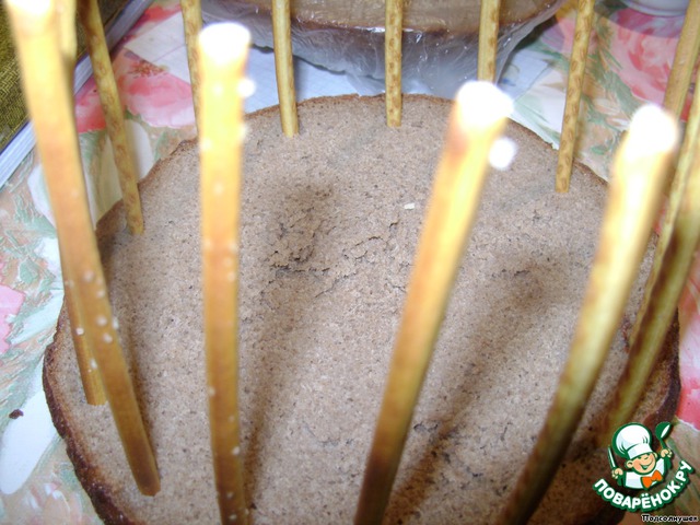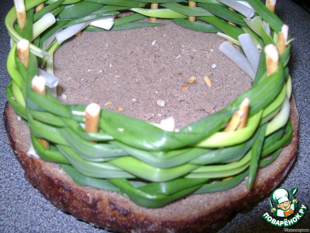 Сразу хочу обратить внимание, что оценивать салат, а не корзинку, так как это не моя идея - это чтобы не было недоразумения. Но если кто-то пропустил, то от ржаного хлеба отрезаем низ, по кругу вставляем соломку и затем плетём зелёным луком