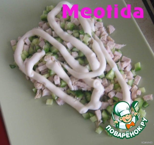выкладываем на тарелку курино-огуречный слой, промазываем заправкой