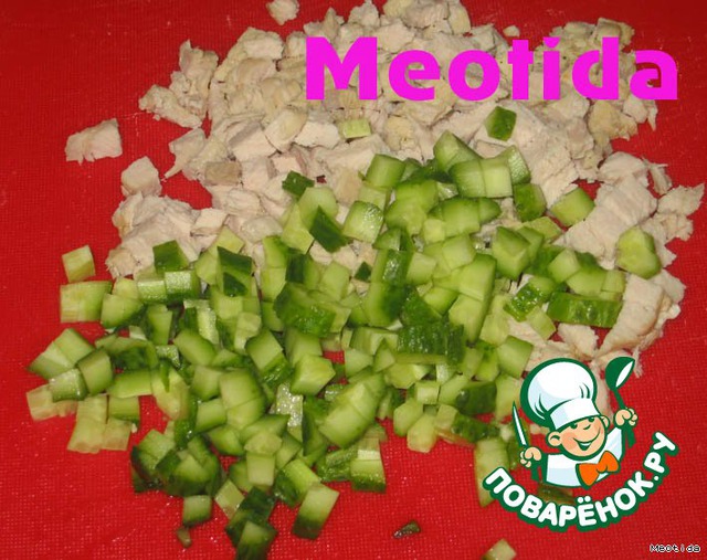 курочку и огурчин нарезаем мелкими кубиками