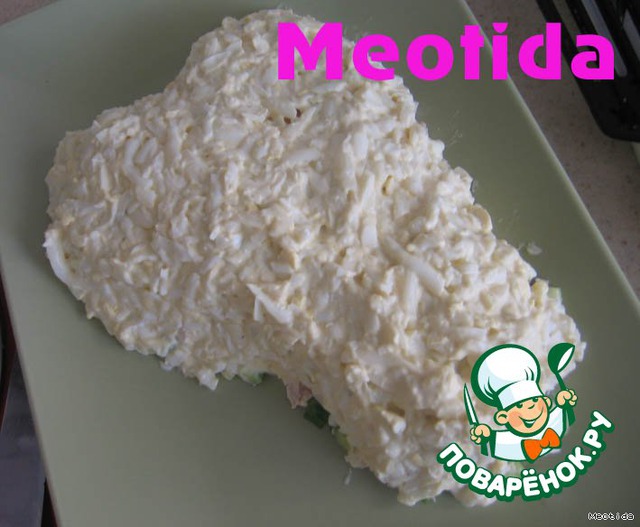 яйца трем на крупной терке, чесночок измельчаем, смешиваем с заправкой и равномерно покрываем получившейся массой салат