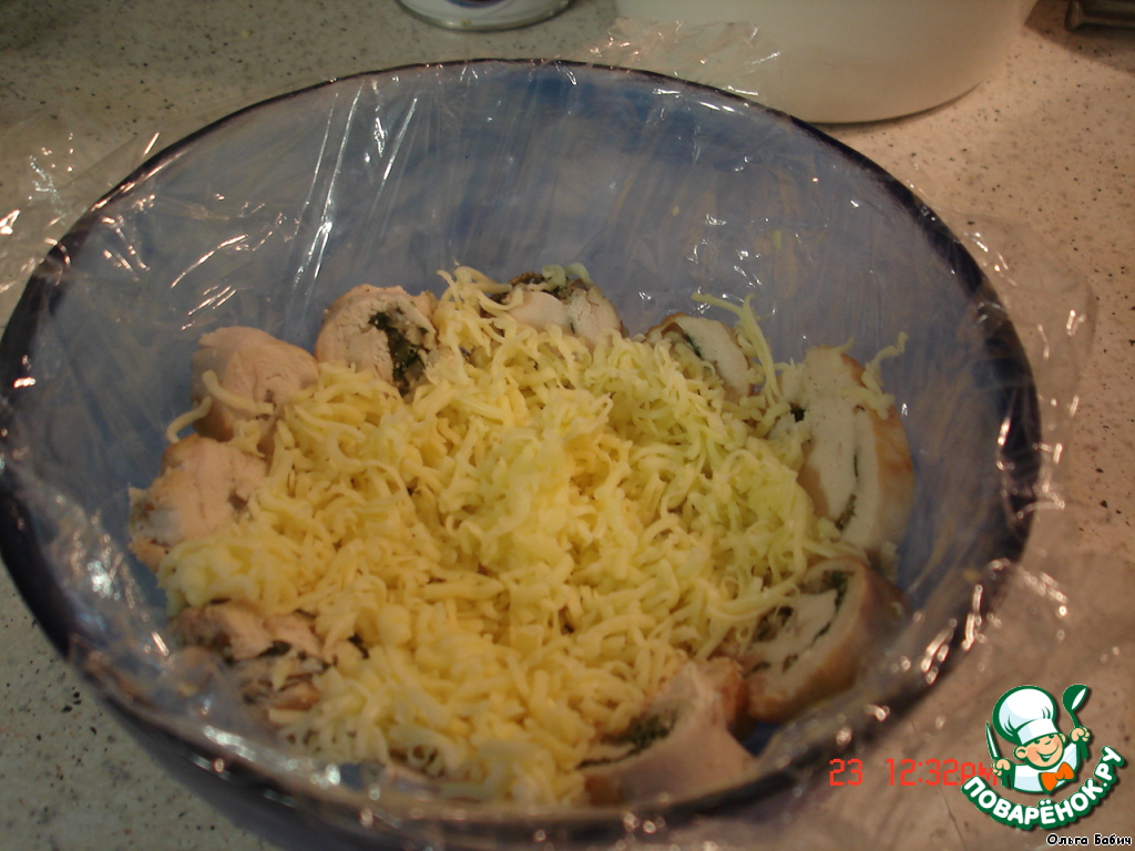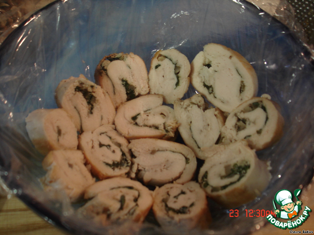 Нарезать рулетики небольшими кусочками и выложить в форму, застеленную пищевой пленкой.