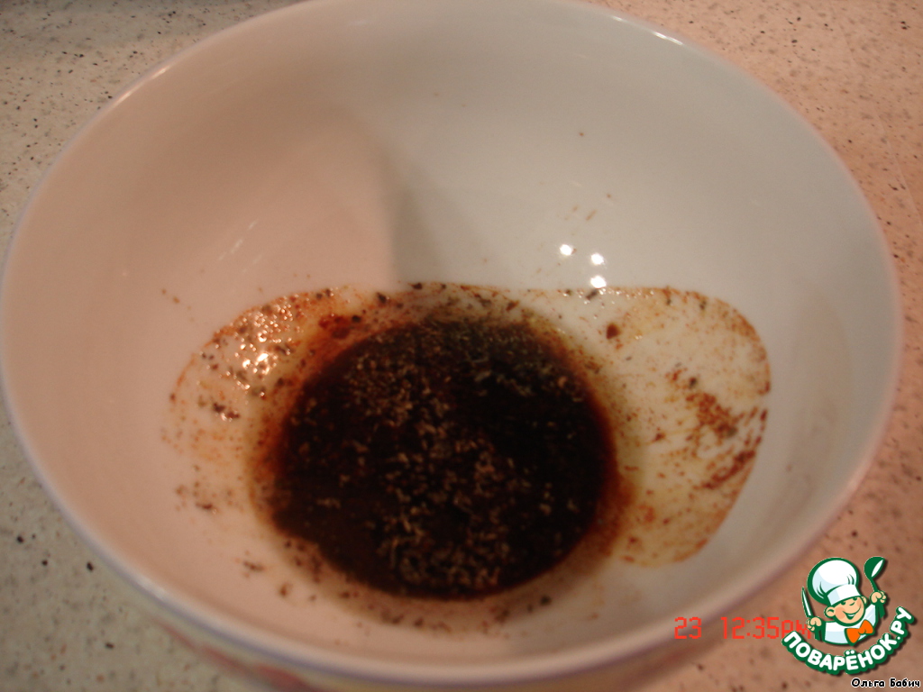 Для соуса: смешать оливковое масло, соевый соус, специи, соль, чеснок, пропущенный через пресс, сок лимона.