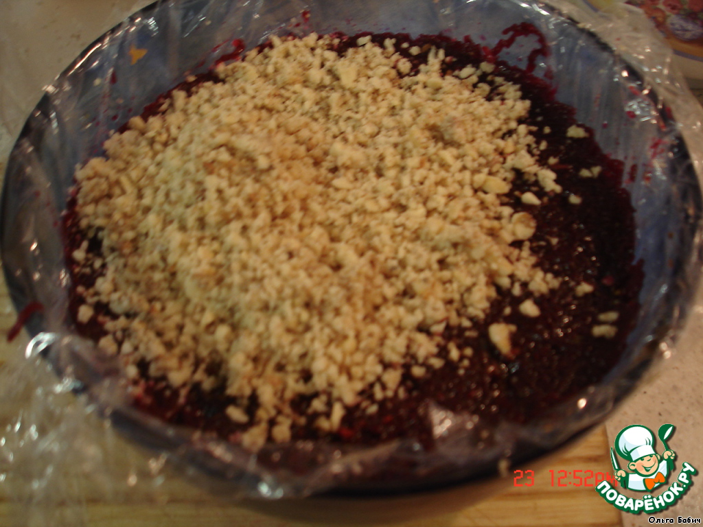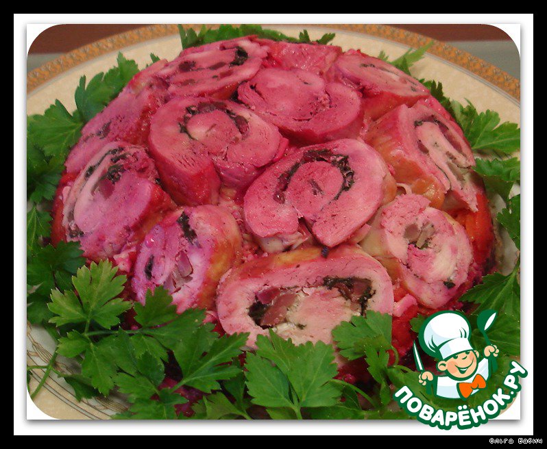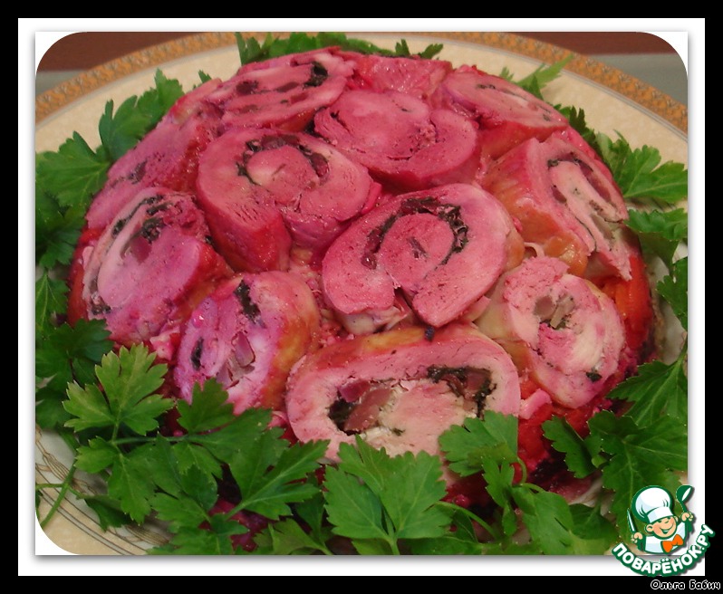 Аккуратно переворачиваем на блюдо, снимаем пленку, украшаем зеленью.