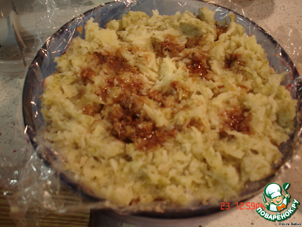 Трем картофель и соленый огурец, перемешиваем и укладываем сверху орехов.