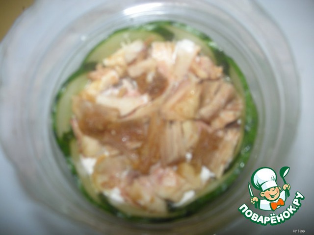 Картофель, яйца, куриное бедрышко – сварить. Огурец нарезать тоненько наискосок, выложить в форму (у меня обрезанная пластиковая бутылка). Затем выкладываем все ингредиенты в формочку :