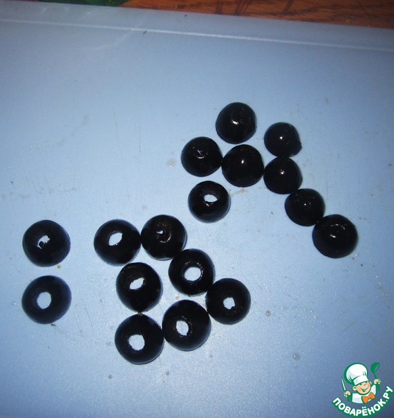 Маслины без косточки разрезать на половинки. Они нужны нам для украшения.