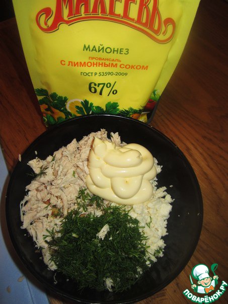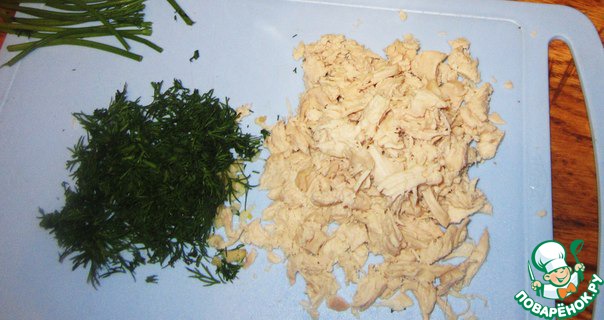Готовую грудку, чеснок и укроп мелко нарезать. Веточки от укропа не выбрасывать, они тоже нужны для украшения.