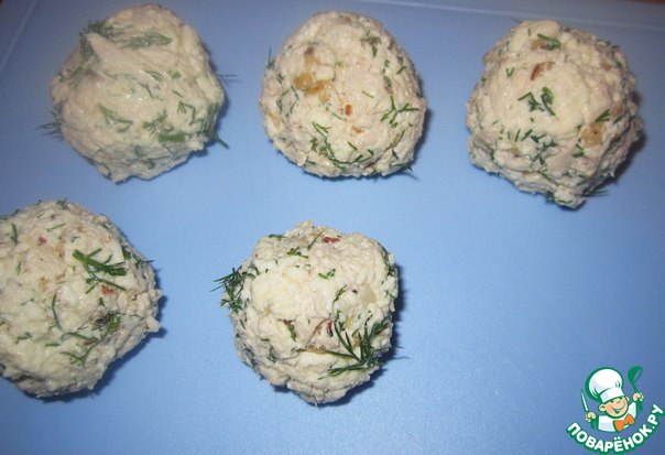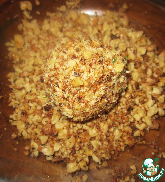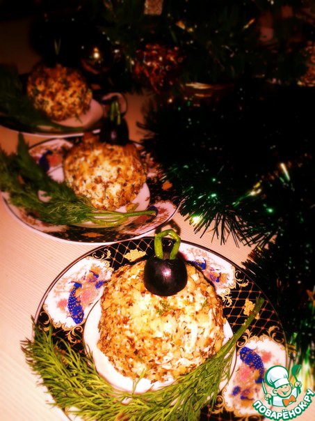 Обвалять их в орехах, сверху положить половинку маслины и в нее поместить в виде петельки веточку от зелени!