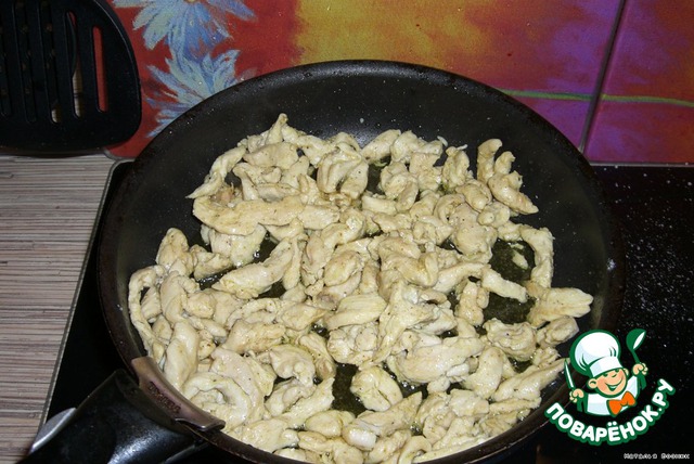 Куриное филе нарезать тонкими полосками, обжарить, посолив-поперчив по вкусу