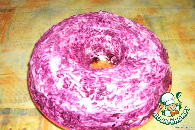 | Салат Гранатовый браслет своим видом вызывал у меня аппетит, НО Очень не люблю в салатах гранаты... Вот решила я оставить форму Браслета, остальное - по своему вкусу.. Гости были в восторге!!! |