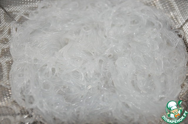 Готовую фунчозу промываем в дуршлаге холодной водой.