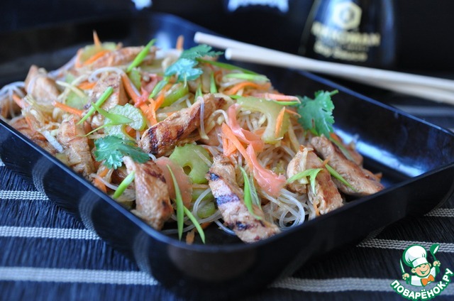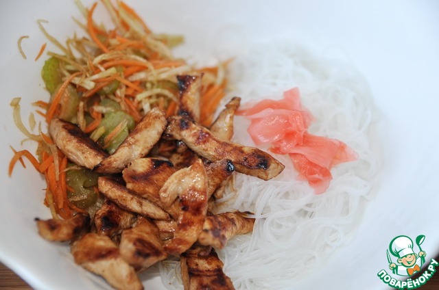 В фунчозу кладём филе курицы-гриль, маринованные овощи вместе с маринадом.