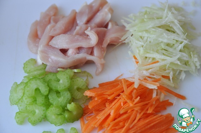 Овощи моем, чистим, куриное филе обсушиваем бумажным полотенцем.