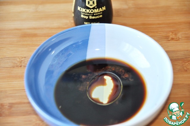 Готовим маринад. Берём соевый соус "Киккоман", добавляем рисовый уксус, оливковое масло и табаско.