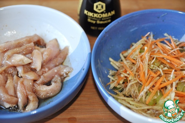 Пока курица и овощи маринуются, варим фунчозу, согласно инструкции на упаковке. Я кладу в кипяток на 3 минуты.