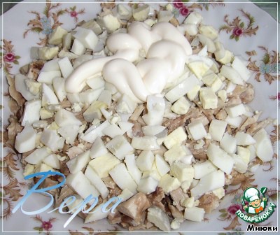 Яйца отварить вкрутую, очистить, нарезать кубиками.