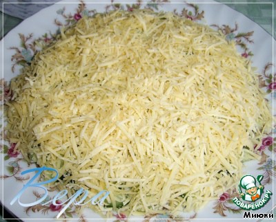 Выкладывать салат на блюдо слоями, промазывая майонезом.