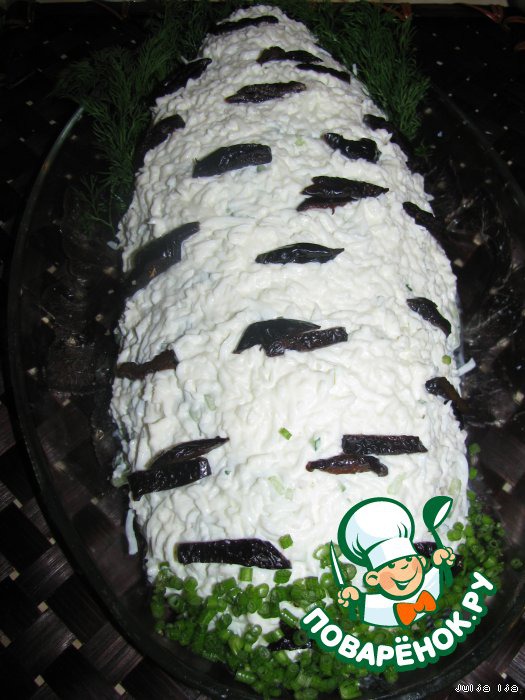 Чернослив промыть, нарезать соломкой. Выложить "пятнышки" на берёзе.